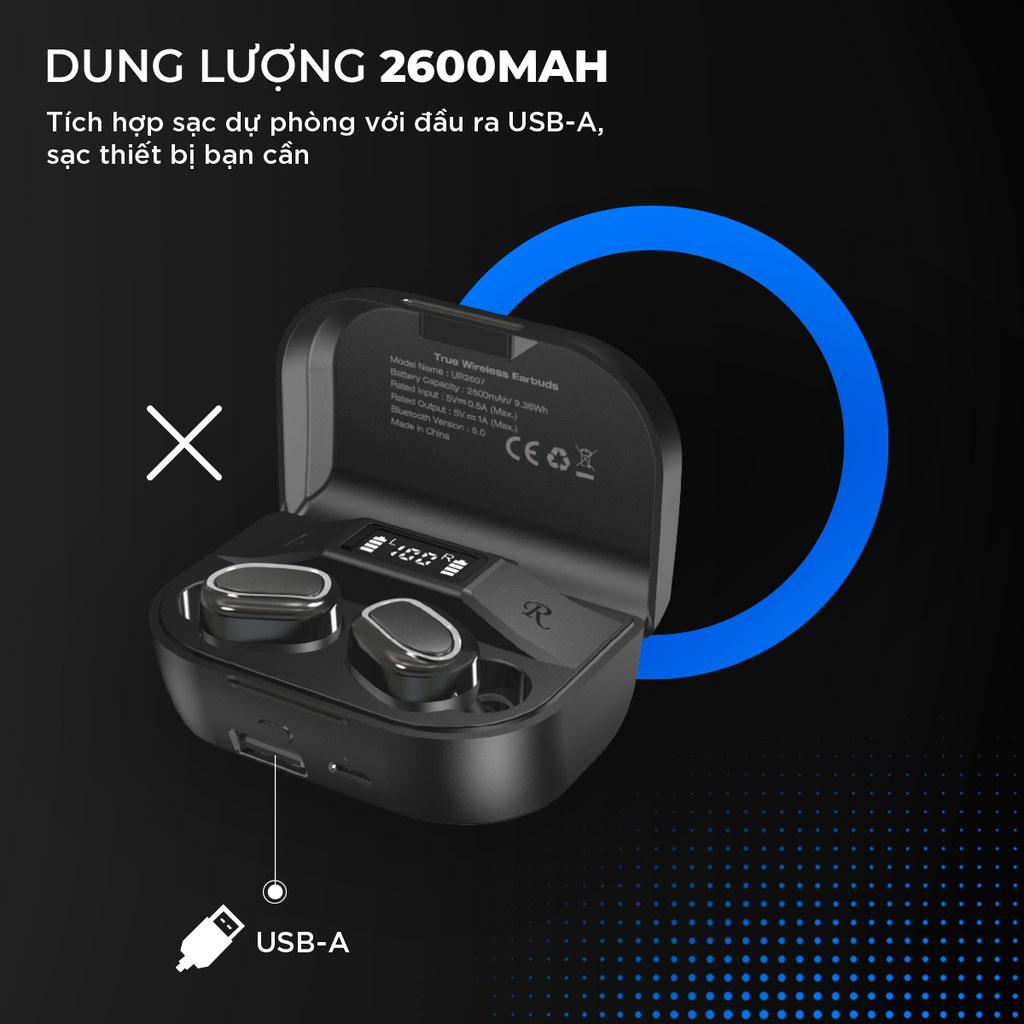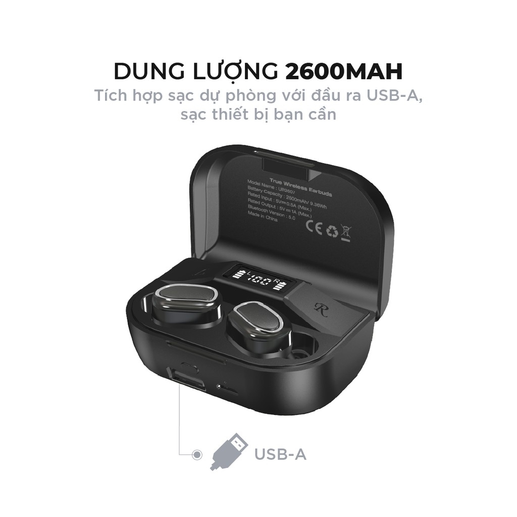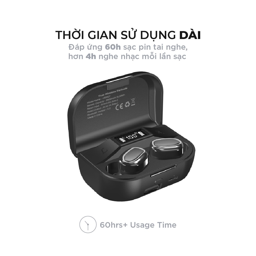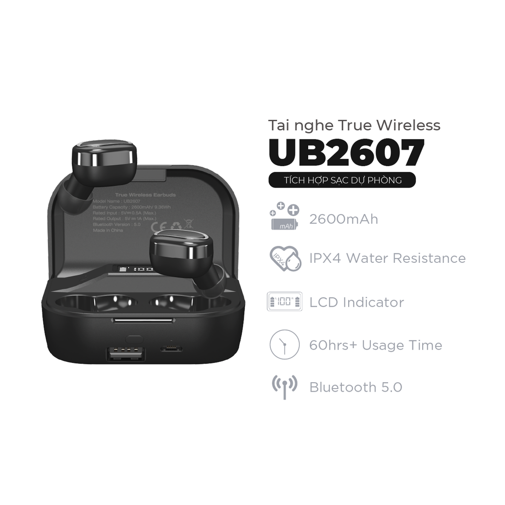 Ngoài chức năng nghe nhạc thông thường, UB2607 vừa sạc pin cho hai tai nghe vừa sử dụng như pin dự phòng để sạc cho điện thoại của bạn với đầu ra là 5V/ 1A. Mọi cuộc gọi nguy cấp hay cần tra cứu dữ liệu khi điện thoại chợt hết pin, Pin dự phòng trên hộp tai nghe sẽ cứu nguy cho bạn ngay tích tắc.