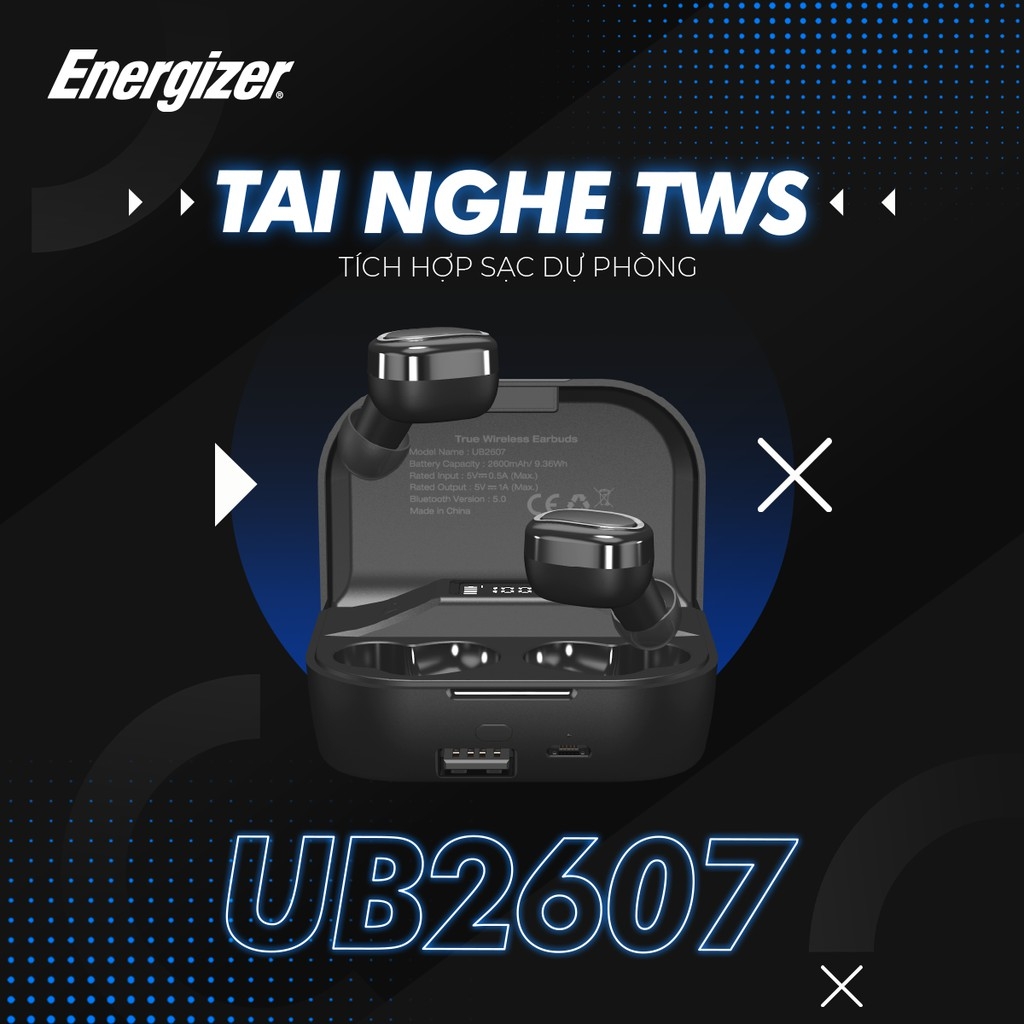 Là một trong những sản phẩm của series tai nghe True Wireless Energizer, UB2607 mang trên mình thiết kế chuẩn dòng tai nghe không dây TWS như các loại tai nghe của khác. Hơn hết, UB2607 cũng thể hiện nét đặc trưng của một thương hiệu hàng đầu về sản xuất pin năng lượng – Tích hợp sạc dự phòng